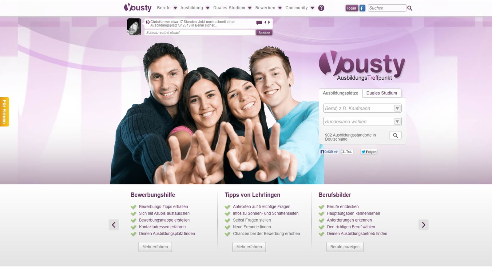 Ralph Dennes: Yousty.de ist ein Online-Berufsnetzwerk für Azubis und Duale Studenten im Web 2.0 und geht in Inhalt und Funktionalität somit deutlich über die klassische Ausbildungsplatzstellenbörse hinaus. Wir können das, was andere auch können. Aber wir können mehr! Die interessierten Schüler aus ganz Deutschland finden auf Yousty.de natürlich eine individuelle Darstellung der Unternehmen über deren Profil mit Fotos, Videos, Links, vakanten Stellen und vieles mehr. Aber darüber hinaus finden sie on top quasi „live“ besonders glaubwürdige Kronzeugen, nämlich die Azubis, die dort bereits diesen Beruf erlernen und die Ausbildung erleben. Yousty.de ist für Schüler gemacht, spricht die Sprache der Schüler, was man auch an unserer ständig wachsenden Facebook-Gruppe mit knapp 30.000 Fans sieht. „Der Wurm muss ja schließlich dem Fisch schmecken und nicht dem Angler.“